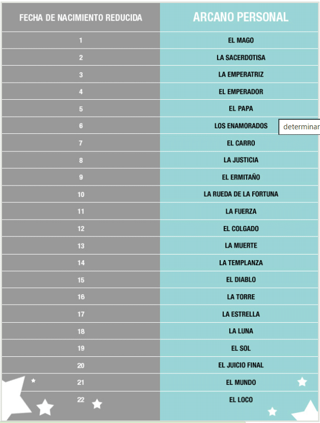Luego se suman todos los números y se reduce hasta obtener un número entre 1 y 22. Ese número indica el arcano mayor que “regirá” simbólicamente ese año para esa persona.