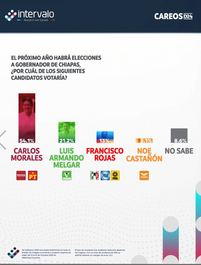 Aseguran que para esta medición se realizaron 1000 encuestas telefónicas en todo el estado a hombres y mujeres mayores de edad, del 12 al 16 de octubre en diferentes horarios, con un nivel de confianza del 95%,la encuesta se realizó mediante una selección aleatoria de hogares chiapanecos.