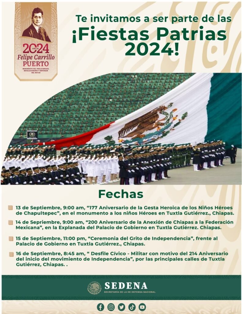 En Chiapas, la Secretaría de la Defensa Nacional en estrecha coordinación con el Gobierno del Estado de Chiapas, informó a la población en general que todo está listo para la realización de los eventos cívicos para el mes de septiembre 2024.