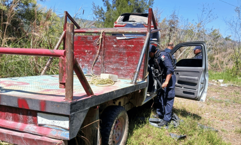 El primer aseguramiento se realizó en el tramo carretero Pantelhó – Colonia Nueva Jerusalén, a la altura del crucero, donde se localizó un vehículo Nissan Estaquita, color blanco con plataforma, sin placas de circulación, en estado de abandono.
