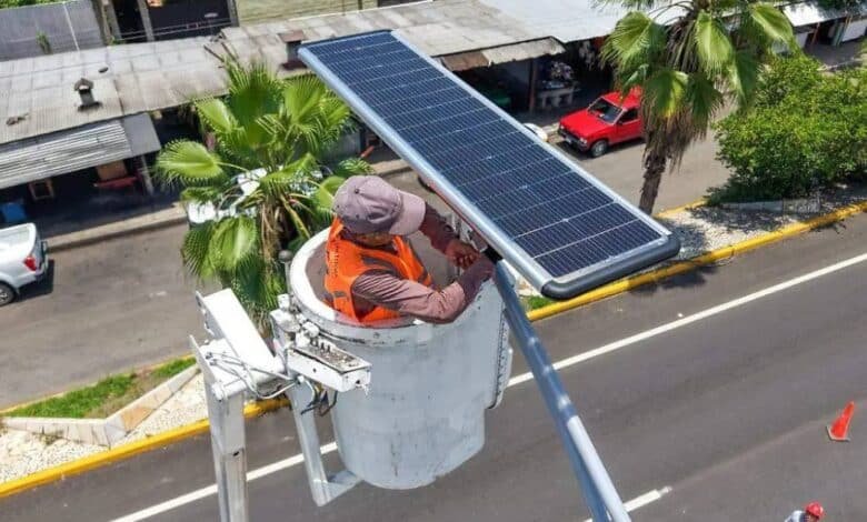 La obra consta de la instalación de 414 luminarias solares de 120 watts, 147 postes de nueve metros, 162 luminarias de 100 watts, 53 postes de ocho metros y 107 bases de concreto.