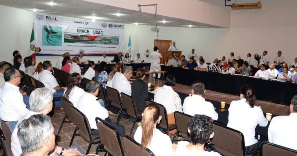 Durante el Encuentro Binacional entre la Benemérita Universidad Autónoma de Chiapas y el Centro Universitario de San Marcos de la Universidad de San Carlos Guatemala, (UNACH-USAC), donde se presentó el Programa Universitario “Quetzal: Espacio Común de Educación Superior Chiapas–Centroamérica”.