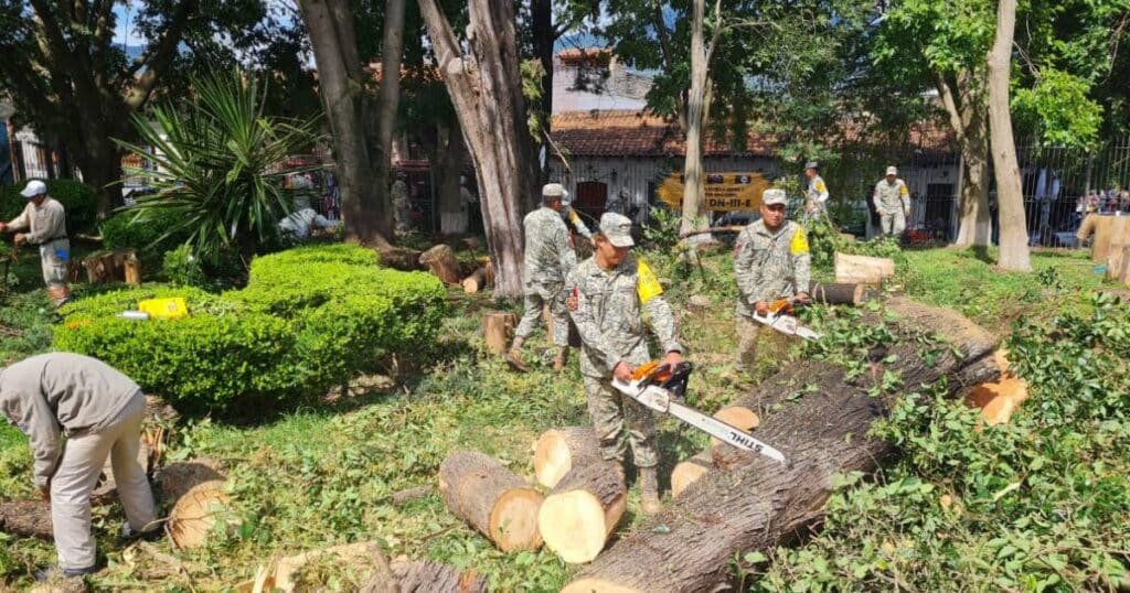 Por lo que el Personal Militar continúa prestando apoyo en actividades de limpieza, retiro de árboles y ramas caídas, remoción de escombros, entre otras actividades.