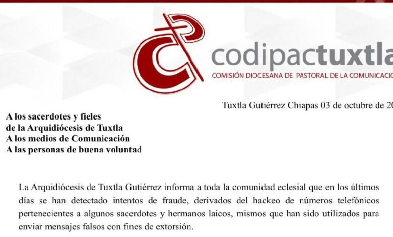 En Chiapas, la Arquidiócesis de Tuxtla Gutiérrez alertó a la comunidad católica sobre recientes intentos de fraude y extorsión derivados del hackeo de números telefónicos pertenecientes a sacerdotes y hermanos laicos.