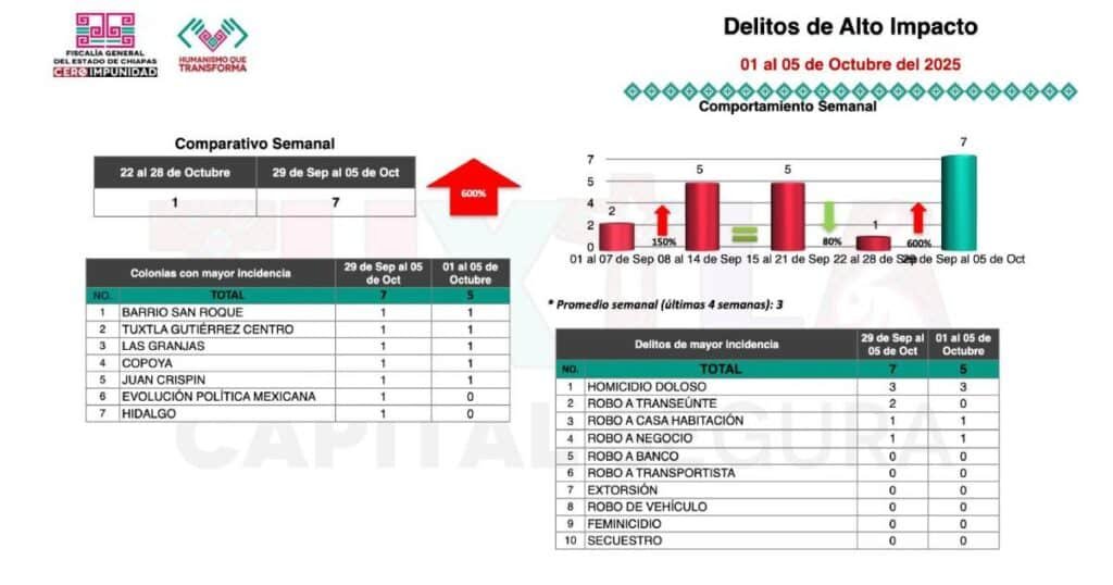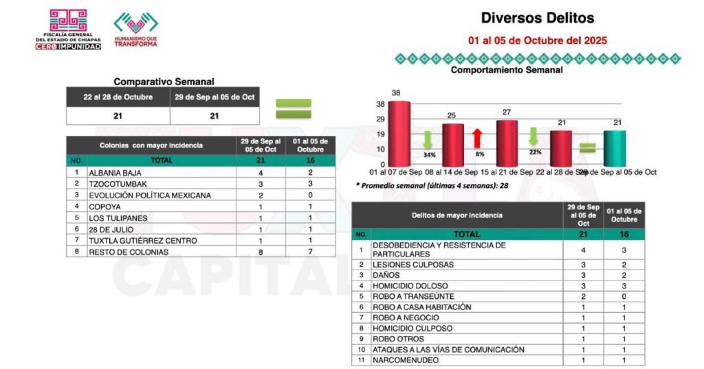 Durante esta transmisión en vivo, Llaven Abarca presentó la incidencia delictiva en Tuxtla Gutiérrez de la semana que concluyó este 5 de octubre, que en el caso de los delitos diversos se mantuvo en comparación con la semana pasada, con 21 inicios de carpeta de investigación, principalmente relacionados con delitos culposos, desobediencia de particulares, lesiones culposas, daños, robo a transeúnte y homicidios culposos.
