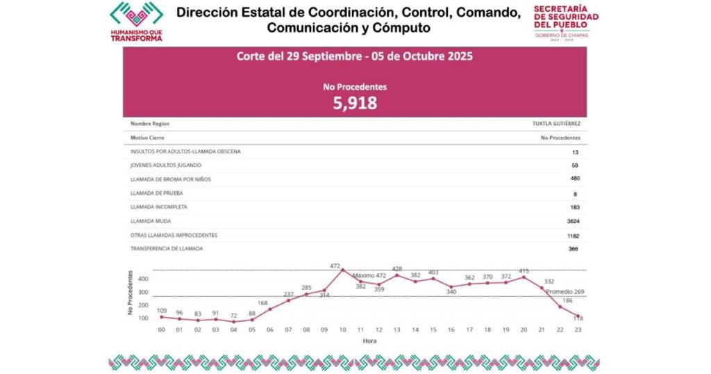 Mencionó que, en coordinación con el C5 Escudo Pakal, se han iniciado investigaciones para identificar los números telefónicos que realizan un uso indebido de los servicios de emergencia, logrando la primera detención de María “N”, quien asumió la responsabilidad por múltiples llamadas improcedentes realizadas desde un número utilizado por su hijo menor de edad. La señalada ofreció una disculpa pública al pueblo de Chiapas e hizo un llamado a la ciudadanía a no incurrir en esta conducta irresponsable.