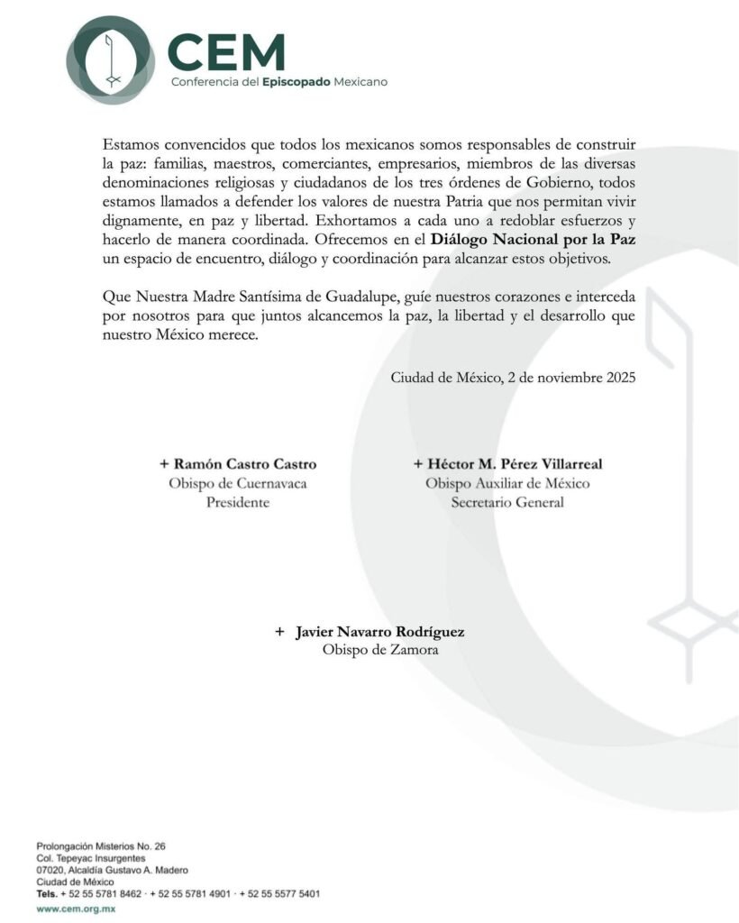 Finalmente, la Iglesia hizo un llamado a toda la sociedad mexicana —familias, maestros, comerciantes, empresarios, ciudadanos y autoridades de los tres órdenes de gobierno— a construir la paz de manera coordinada, ofreciendo el Diálogo Nacional por la Paz como un espacio de encuentro y acción conjunta.