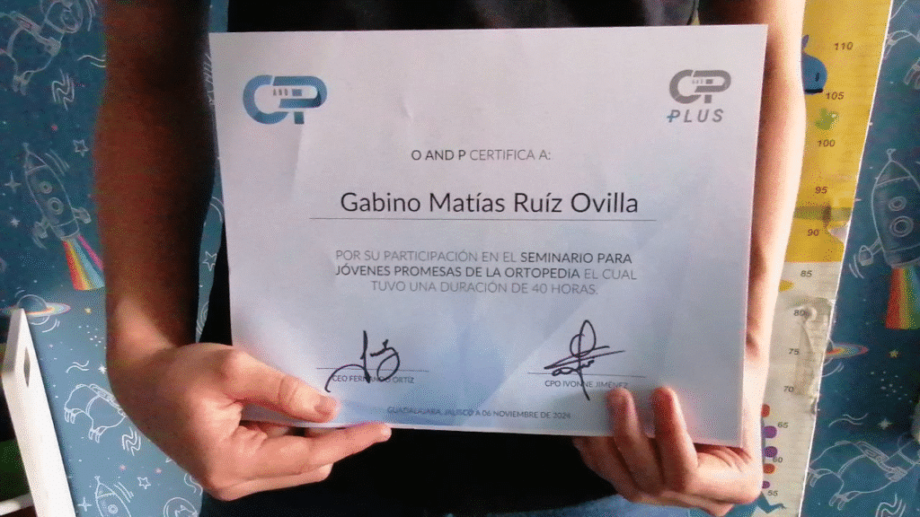 La vocación, disciplina y compromiso social comienzan a rendir frutos. La O&P ANP hizo entrega de un reconocimiento a Gabino Matías Ruiz Ovilla por su destacada participación en el “Seminario para Jóvenes Promesas de la Ortopedia”, realizado en Guadalajara, Jalisco, evento que reunió a talentos emergentes del país enfocados en la atención ortopédica y protésica.
