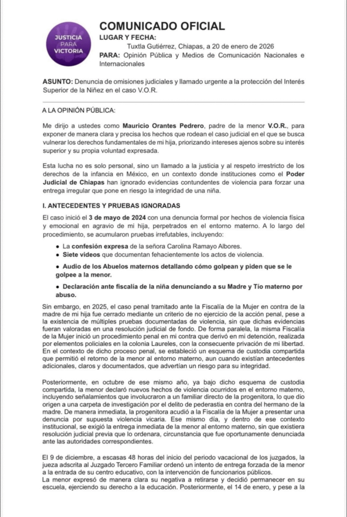 Padre de familia exige justicia para su hija Victoria Orantes, quien asegura ha sido víctima de violencia física y psicológica por parte de su progenitora, así como de abuso por parte del tío materno.