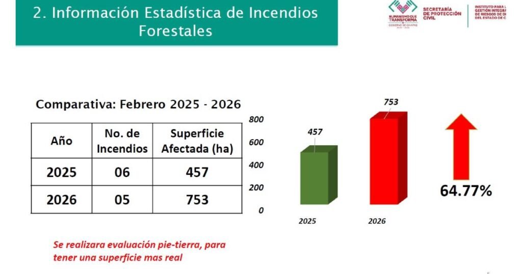 El mismo informe señala que en febrero de 2025 se habían registrado 457 hectáreas siniestradas, mientras que en lo que va de 2026 la cifra a incrementado a 753 hectáreas.