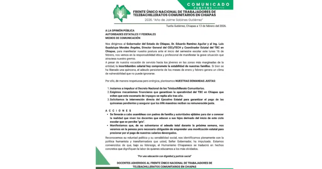 Ante ello, urgieron a las autoridades educativas como el director general de CECyTECH y el coordinador estatal del Telebachillerato Comunitario en Chiapas, así como al gobernador del estado su pronta intervención.