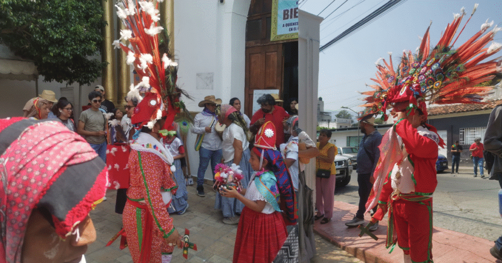 Los danzantes arribaron anunciados con cohetes a la ermita del señor del cerrito, donde ya los esperaban además con pozol blanco como lo marca la costumbre, luego de danzar y lanzar talco o maicena a los asistentes, como parte de la tradición.