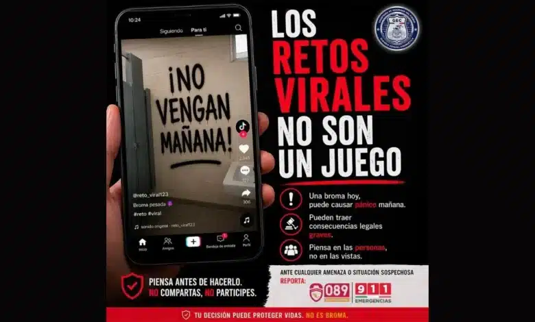 La Guardia Estatal Cibernética de Chiapas emitió un llamado a la población en general, y de manera particular jóvenes, para evitar participar o replicar retos virales que circulan en redes sociales y plataformas digitales, los cuales promueven la difusión de mensajes falsos y amenazantes con el objetivo de generar miedo y pánico social.