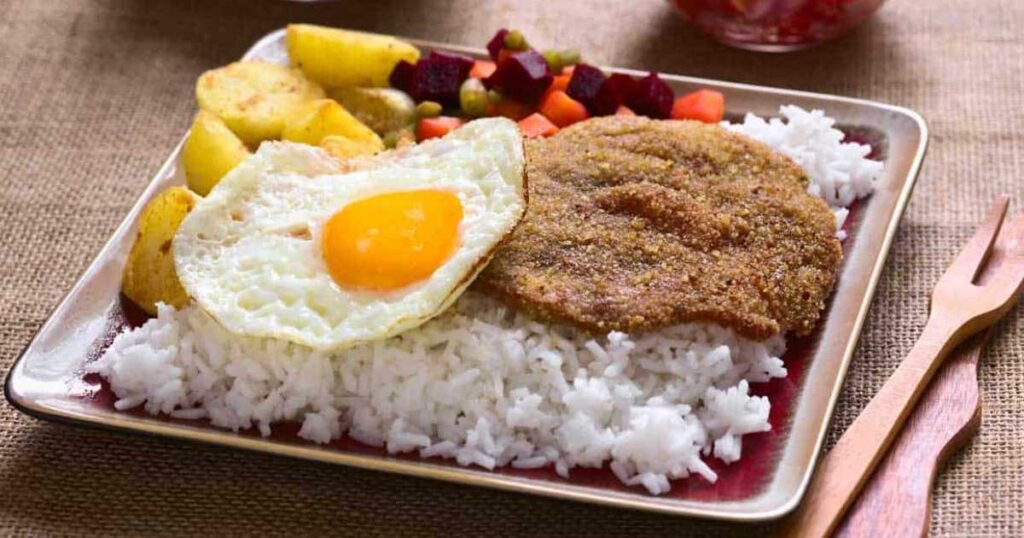 El silpancho consiste en una base de arroz blanco y papas fritas en rodajas, sobre la que se coloca una delgada milanesa de carne empanizada y frita. Encima va un huevo frito con yema blanda y, para rematar, una ensalada fresca de tomate, cebolla y locoto que equilibra la grasa con un golpe de acidez y picante.