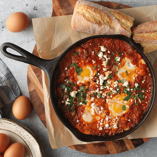 En una sartén profunda, sofríe la cebolla, el ajo y el pimiento hasta ablandar. Agrega los tomates picados y las especias. Cocina hasta obtener una salsa espesa. Haz pequeños huecos en la mezcla y rompe los huevos directamente sobre la salsa. Tapa y cocina a fuego lento hasta que las claras estén cocidas pero las yemas sigan suaves. Sirve con pan pita o tostadas.