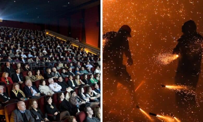Un video en redes sociales muestra cómo la audiencia entró en pánico y buscó salidas entre los fuegos pirotécnicos, generando una estampida en las salidas del cine.