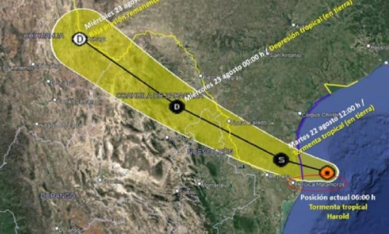 Este miércoles, la depresión tropical “Harold” continuará generando condiciones propicias para lluvias de intensidad fuerte a muy fuerte, acompañadas de rachas de viento de 40 a 60 km/h y posibles torbellinos en áreas de Tamaulipas (noroeste), Nuevo León, Coahuila (norte) y Chihuahua (noreste). Estas condiciones irán disminuyendo a lo largo del día, según el Servicio Meteorológico Nacional.