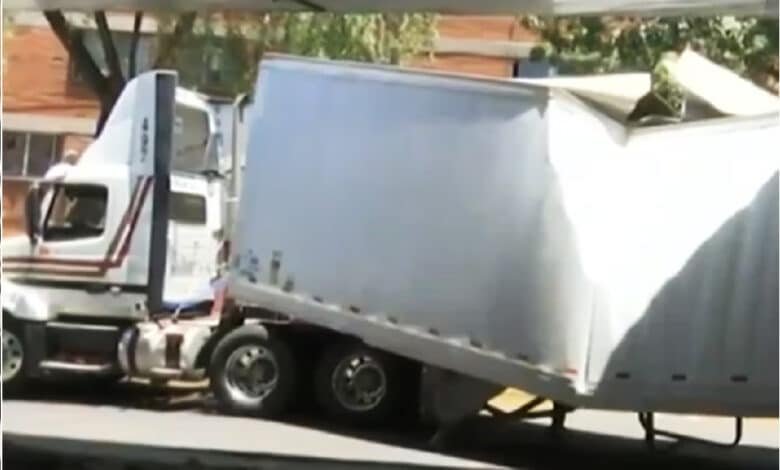 La tarde de este martes 18 de junio, un camión quedó atascado en el bajo puente de Churubusco y Francisco Del Paso Y Troncoso, al intentar pasar la caja del pesado vehículo se atoró y no permitió el avance del vehículo que transportaba cajas de jabón.