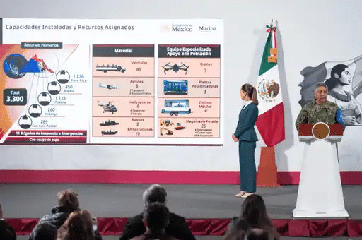 El secretario de Marina, almirante Raymundo Pedro Morales Ángeles, detalló que, a través del Plan Marina, en su fase de auxilio, han desplegado a 3 mil 300 elementos en Veracruz, Puebla, Hidalgo y San Luis Potosí, quienes han otorgado atención a 6 mil 718 personas, apoyados en 85 vehículos; 8 aviones: 2 de transporte y 6 de reconocimiento; 9 helicópteros; 2 buques para transporte de agua y víveres; 19 embarcaciones; 7 drones; 3 plantas potabilizadoras; 4 cocinas móviles y maquinaria pesada.