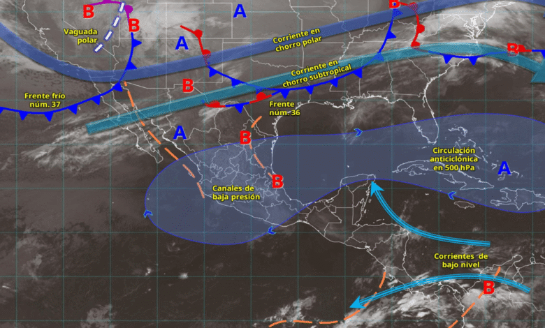 El frente frío 37 recorrerá el noroeste del territorio nacional con rachas de viento de hasta 80 km/h y lluvias aisladas, mientras un anticiclón mantendrá ambiente cálido a caluroso en la mayoría de los estados. Persistirá la onda de calor en zonas del centro y occidente.